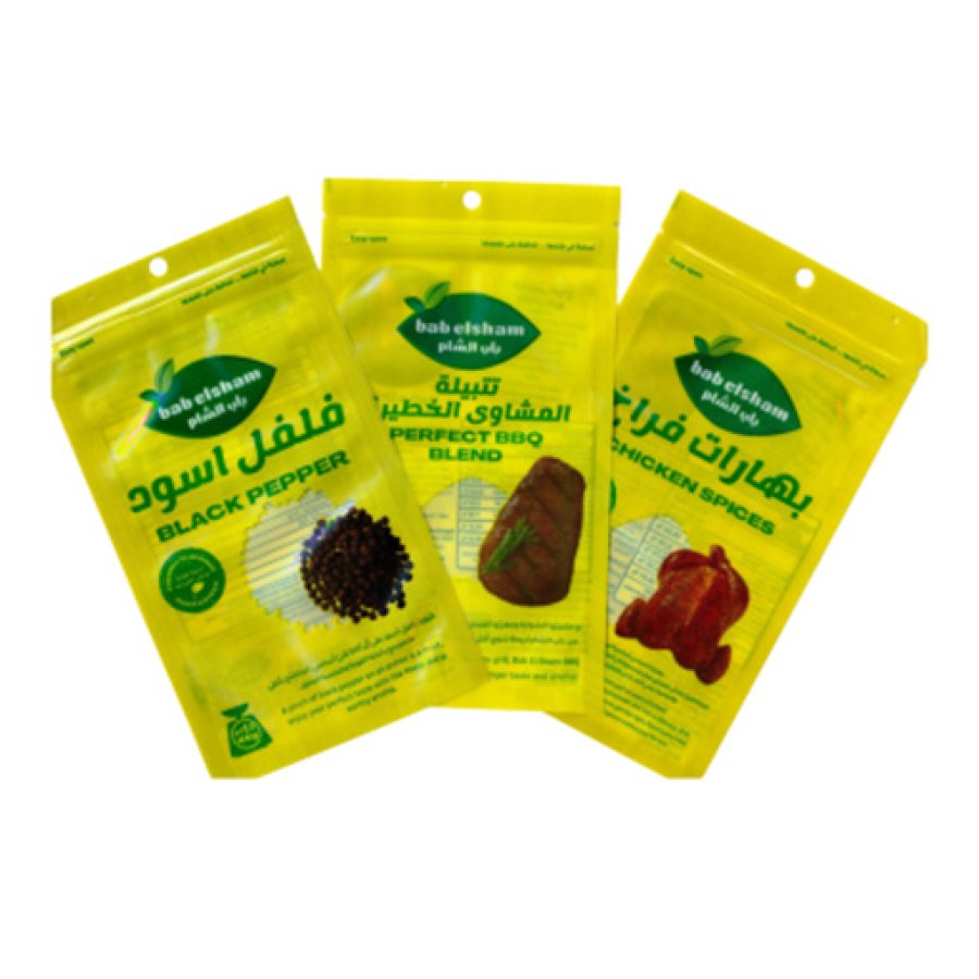 Resealable zipper pouches for spices and seasonings. Aroma-preserving, high-barrier films with bold, shelf-ready branding from Delta.
